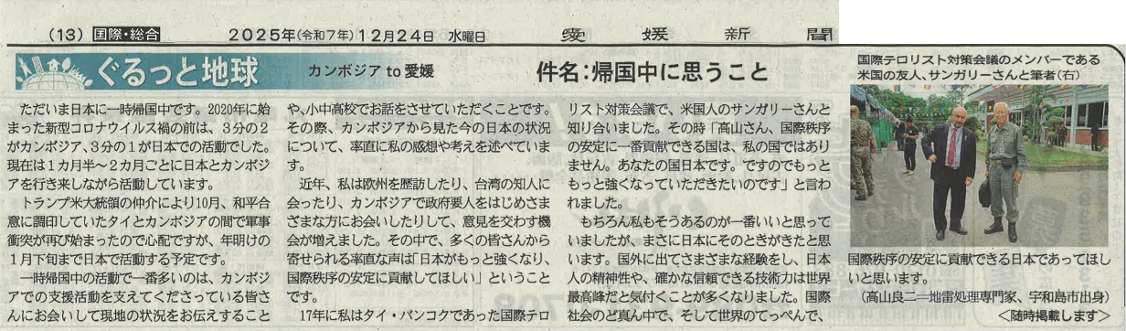 2025年12月24日付 愛媛新聞「帰国中に思うこと」