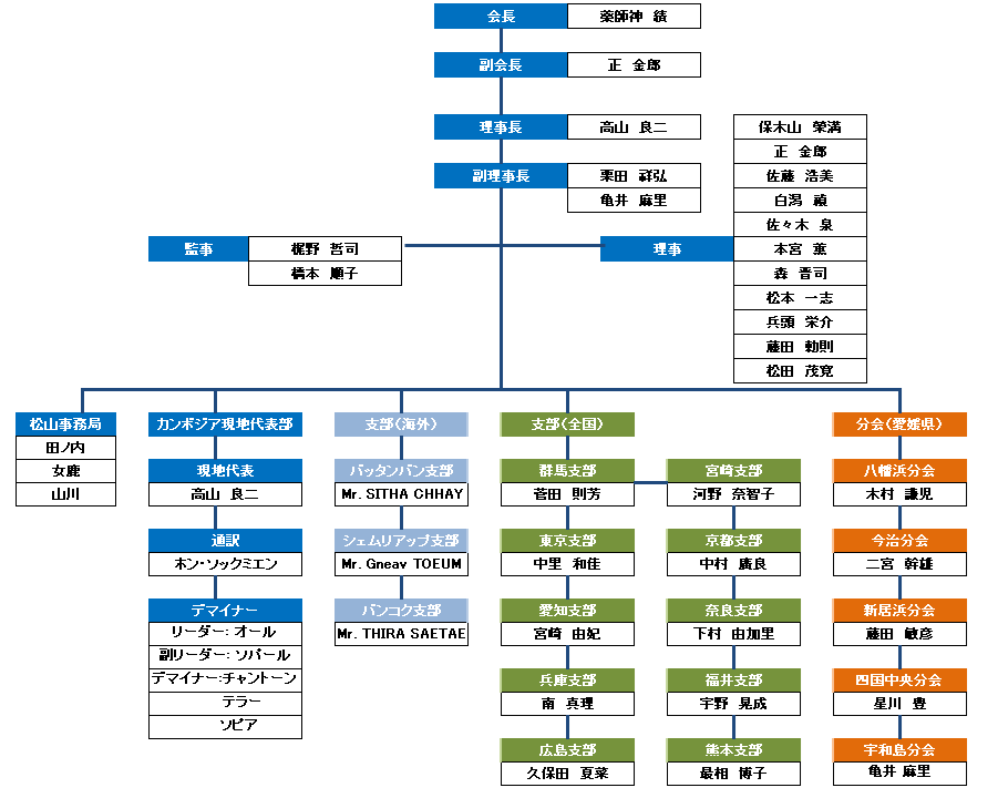 | 所在地 | (松山事務局) 〒790-0011 愛媛県松山市千舟町7-7-3 伊予肥ビル2F (カンボジア宿舎) Au Anlok village,Tasen commune,Kamrieng district, Battambang,Cambodia |